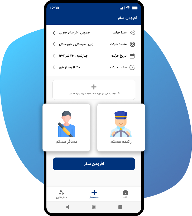 آماده سفر هستید؟اپلیکشن ما با جستجوی هوشمند، به راحتی امکان یافتن مسافران و ماشین های شخصی را برای مقصد مورد نظر شما فراهم میکند. سفر خود را برنامه ریزی کنید، جستجو کنید، رزرو کنید و خاطرات جدید را رقم بزنید.